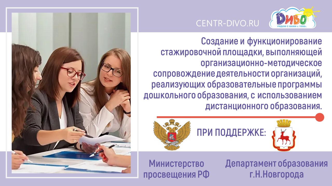 Летом в ЧДОУ «Ц «ДИВО» стартовал проект «Создание и функционирование стажировочной площадки, выполняющей организационно-методическое сопровождение деятельности организаций, реализующих образовательные программы дошкольного образования, с использованием дистанционного образования».