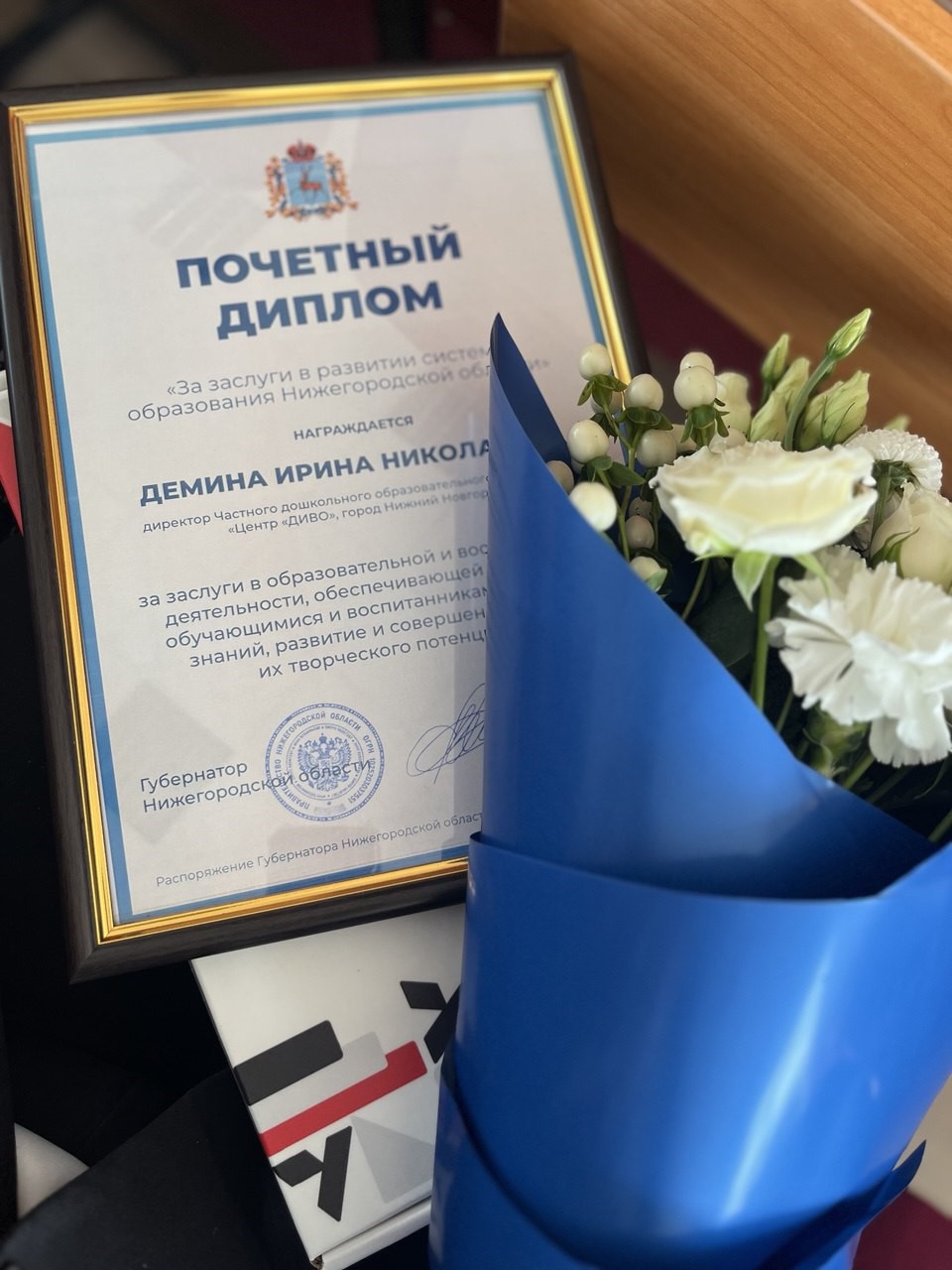 Основателю и директору сети детских центров и садов «ДИВО» Деминой Ирине Николаевне вручен ПОЧЁТНЫЙ ДИПЛОМ ЗА ЗАСЛУГИ В РАЗВИТИИ СИСТЕМЫ ОБРАЗОВАНИЯ Нижегородской области 🥇 Гордимся! ❤
