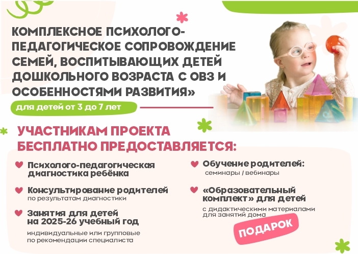 ✍ ПРОЕКТ «КОМПЛЕКСНОЕ ПСИХОЛОГО-ПЕДАГОГИЧЕСКОЕ СОПРОВОЖДЕНИЕ СЕМЕЙ, ВОСПИТЫВАЮЩИХ ДЕТЕЙ ДОШКОЛЬНОГО ВОЗРАСТА ОТ 3 ДО 7 ЛЕТ С ОГРАНИЧЕНЫМИ ВОЗМОЖНОСТЯМИ ЗДОРОВЬЯ И ОСОБЕННОСТЯМИ РАЗВИТИЯ»